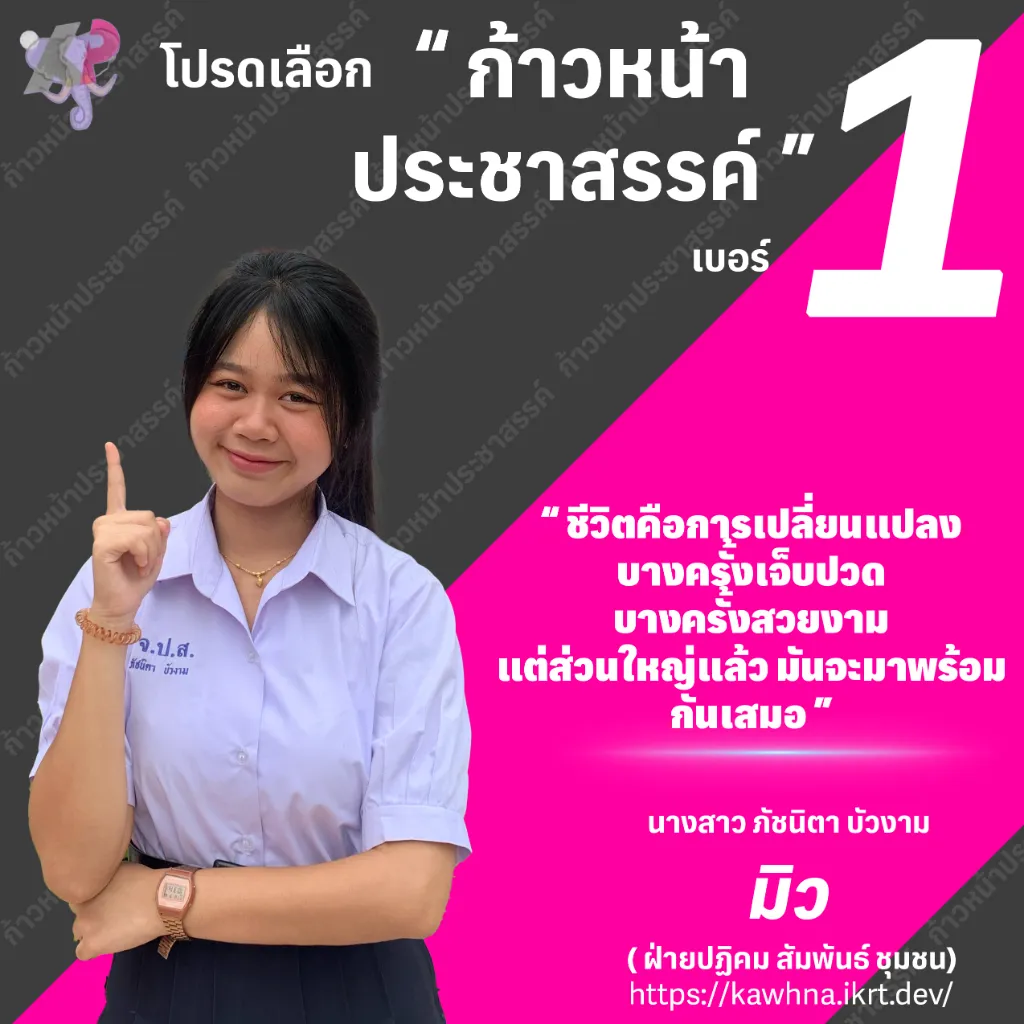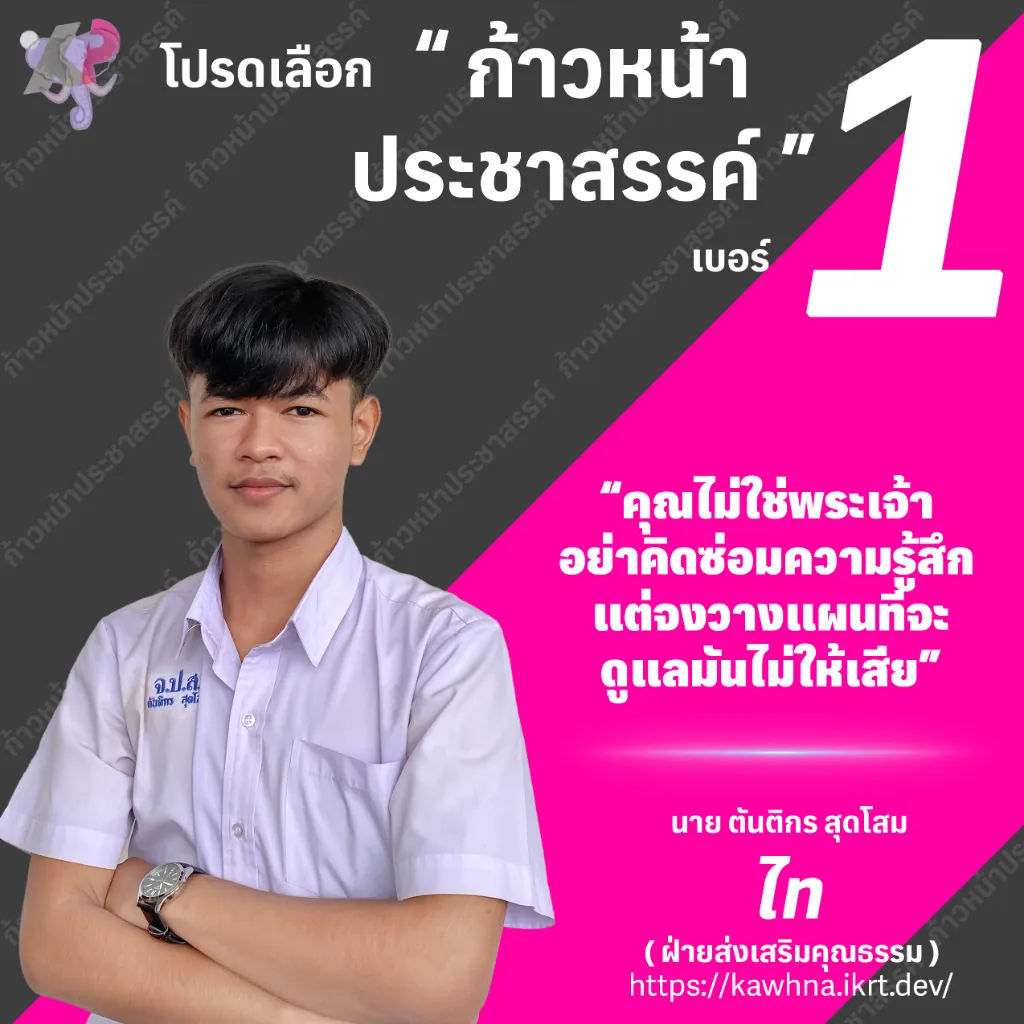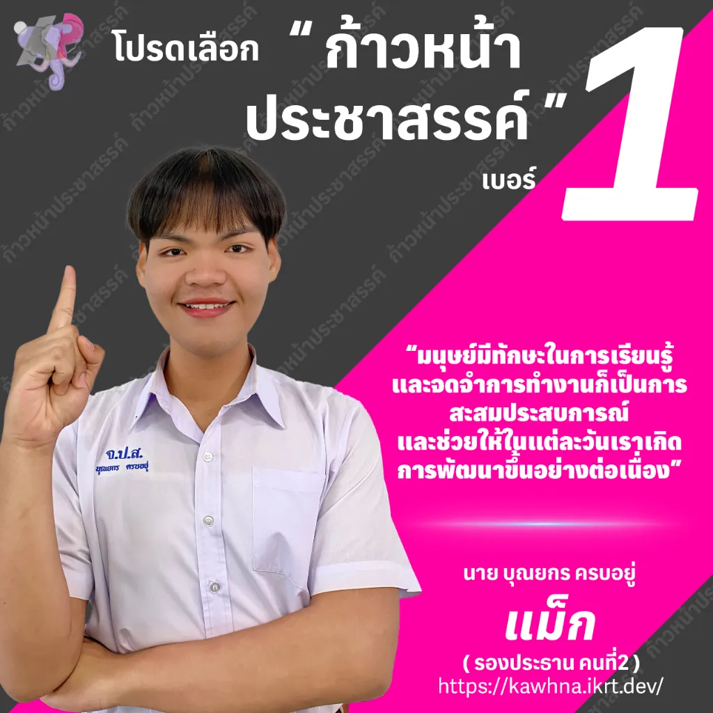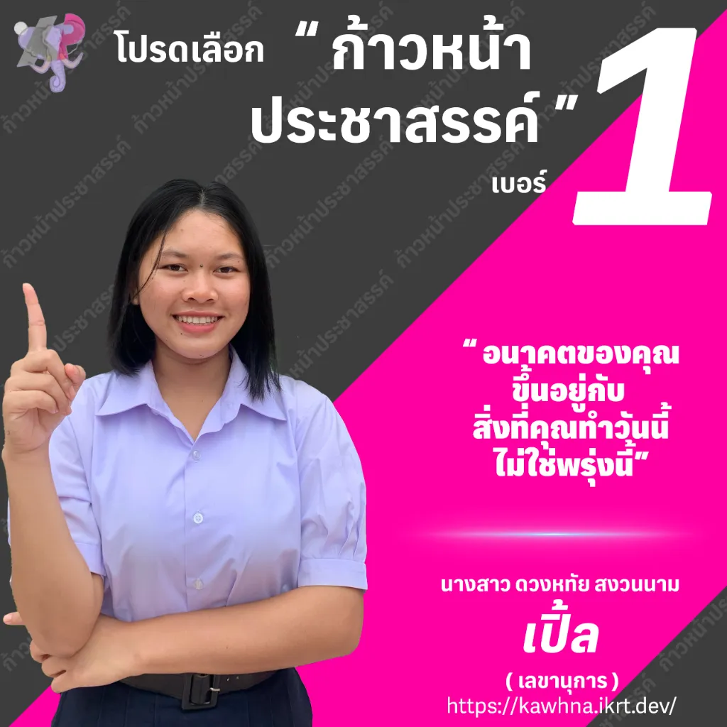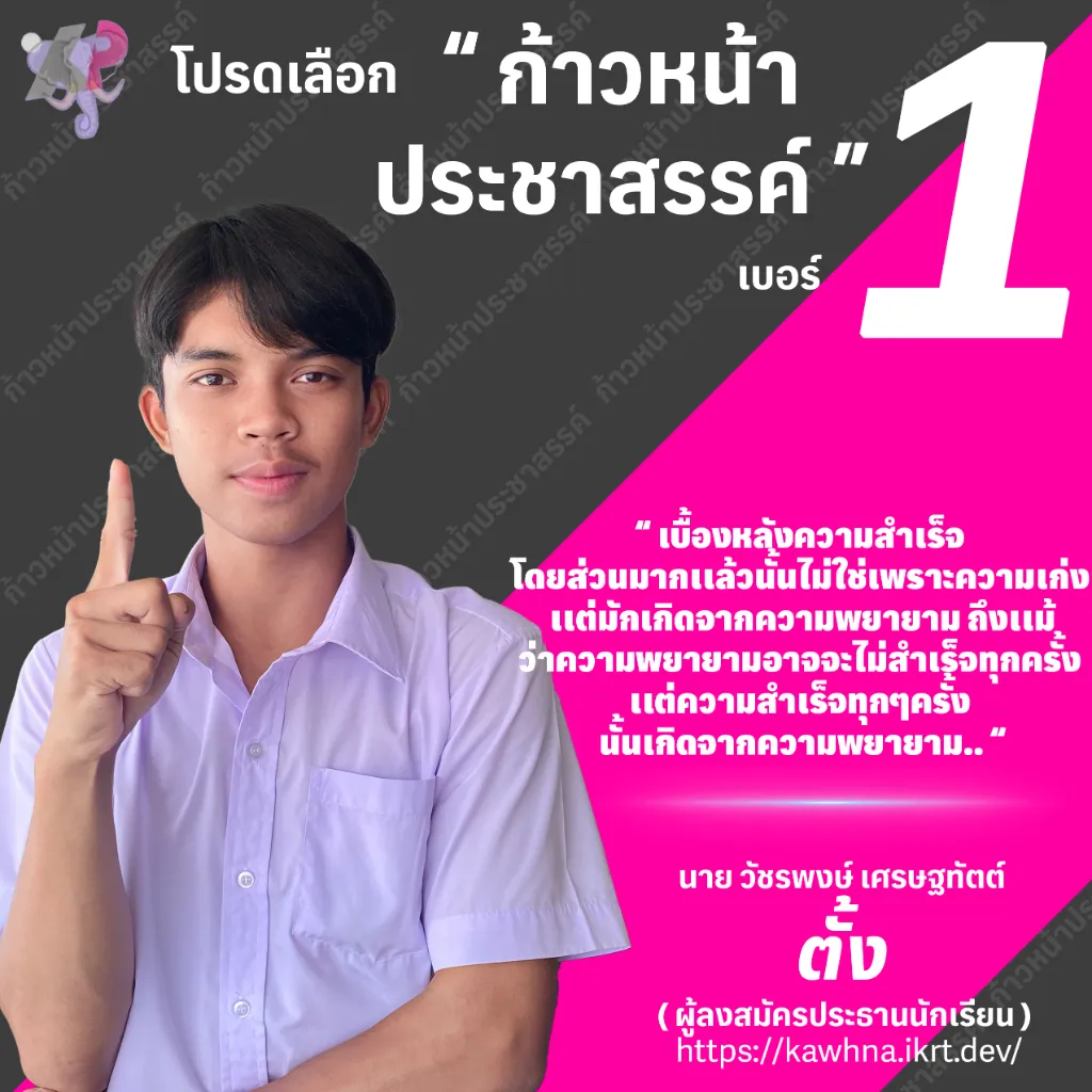 พรรคของเรา มีความเชื่อมั่นว่า นักเรียนคือผู้ที่สามารถเปลี่ยนแปลงสิ่งต่างๆ โดยยึดหลักความมีส่วนร่วมของนักเรียนเป็นหลัก ดั้งนั้นเราจึงลงสมัครเพื่อเป็นตัวแทนของนักเรียน เพื่อนำเสียงสะท้อนของนักเรียนไปส่งถึงผู้มีอำนาจตัดสินใจ ราขอเชิญชวนนักเรียนทุกคนมาร่วมเป็นส่วนหนึ่งกับพรรคก้าวหน้าประชาสรรค์ เพื่อช่วยกันสร้างโรงเรียนเราที่ดีกว่า